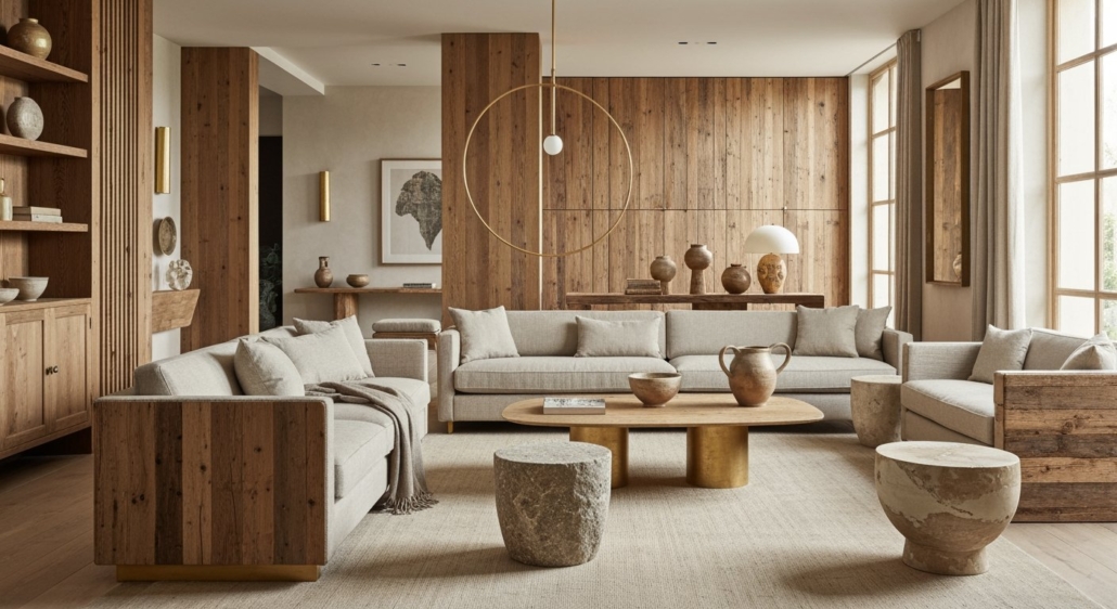 Holz gehört zu den wichtigsten Materialien im nachhaltigen Interior Design und bleibt auch im eklektischen Stil unverzichtbar. Besonders gefragt sind künftig recycelte Hölzer, wiederverwendete Altholzelemente und FSC-zertifiziertes Holz aus verantwortungsvoller Forstwirtschaft.