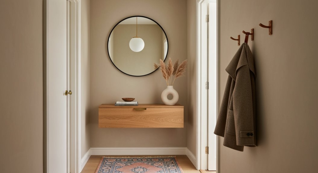 Das Ergebnis ist ein schmaler Flur, der größer, heller und einladender wirkt, während er effizient und aufgeräumt bleibt.